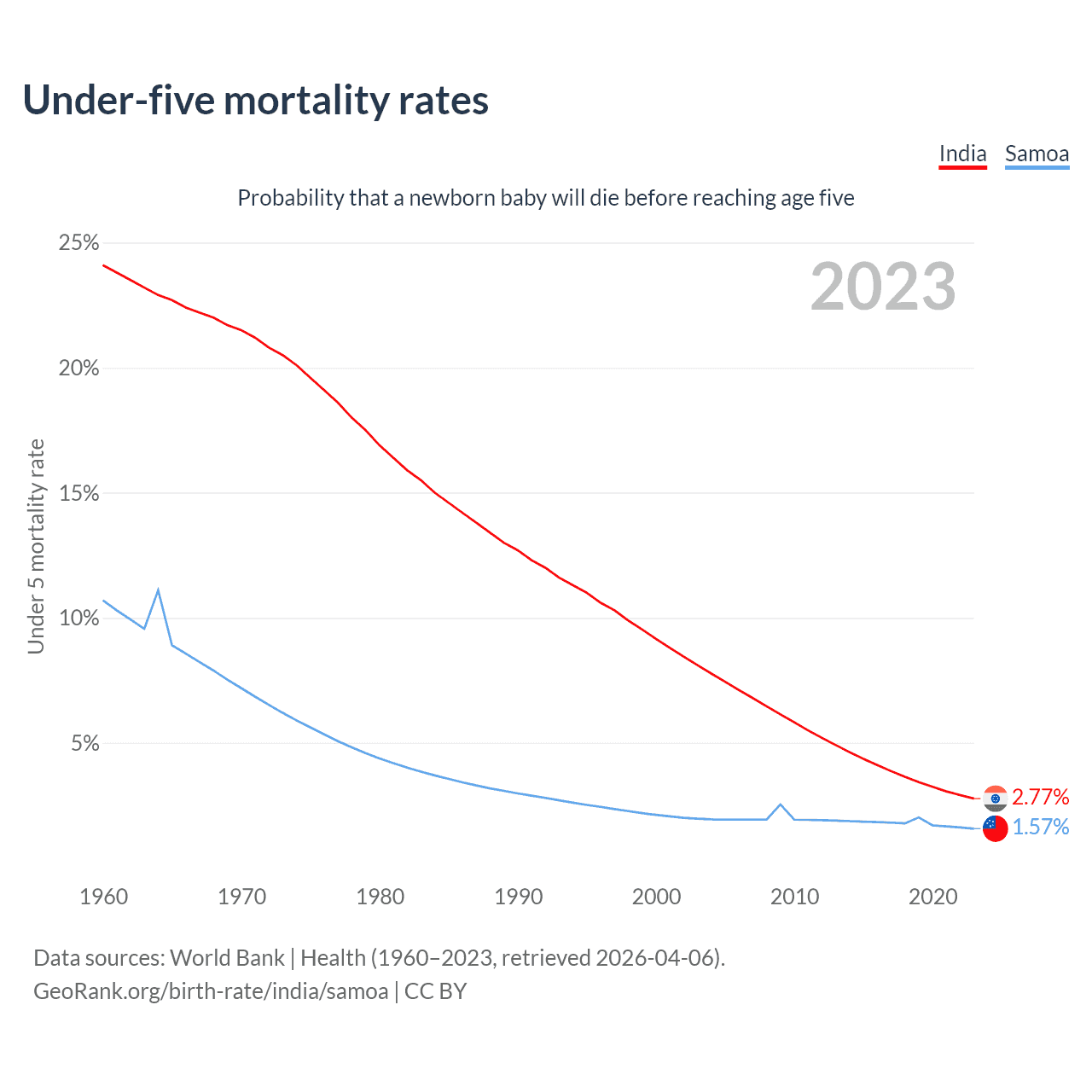 The chance that a newborn baby will die before reaching age five is 2.77% in India and 1.57% in Samoa. Above is a chart with historical data on under-five mortality rates.