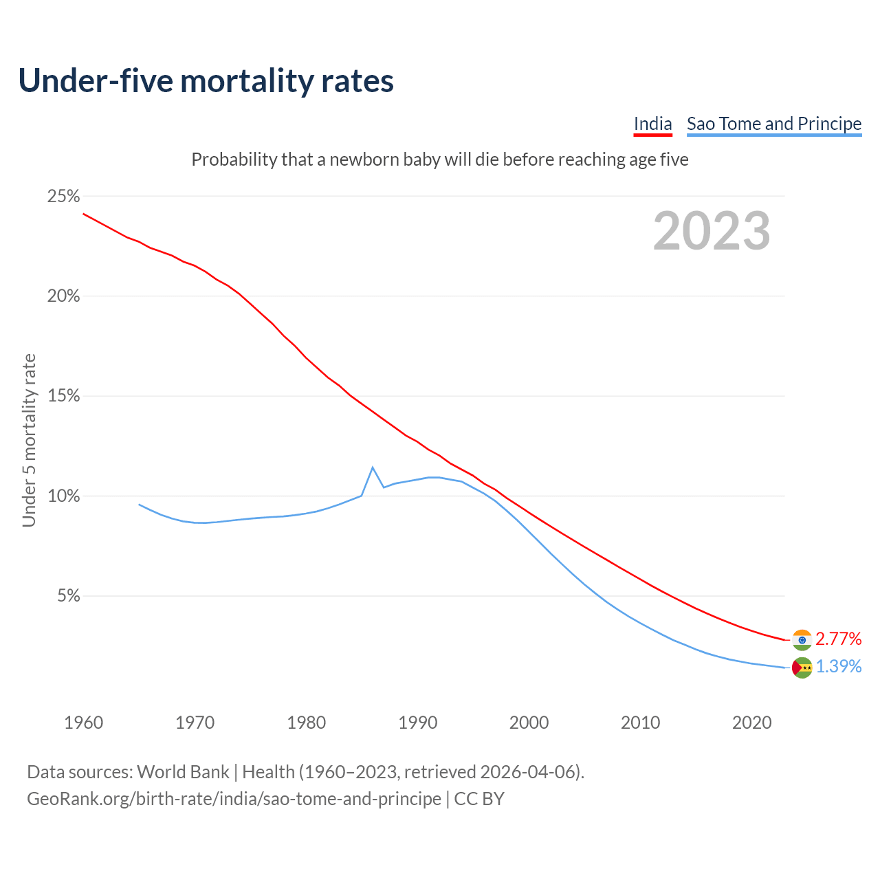 The chance that a newborn baby will die before reaching age five is 2.77% in India and 1.39% in Sao Tome and Principe. Above is a chart with historical data on under-five mortality rates.