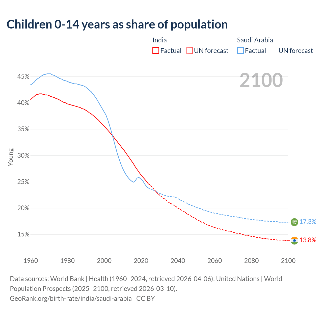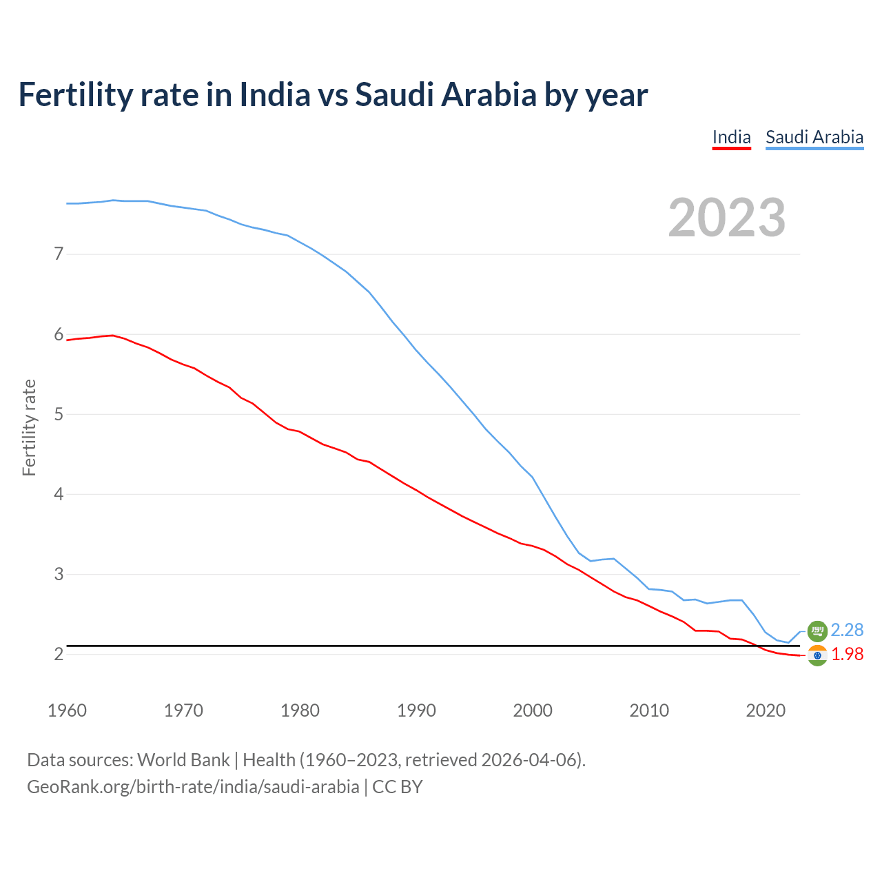 According to the latest available data on birth rates, the fertility rate in India was 1.98 children per woman in 2023, compared to 2.28 in Saudi Arabia in 2023. The replacement level is considered to be 2.1 children per woman.
