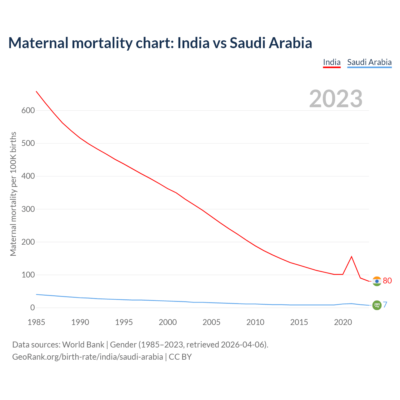 The maternal mortality rate, which is the probability of dying during childbirth or within 42 days of pregnancy termination, is 80 deaths per 100,000 live births in India, compared to 7 deaths in Saudi Arabia.