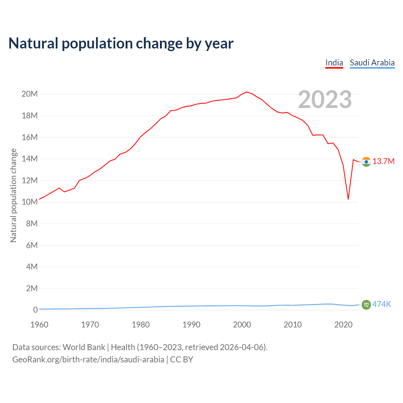 India has an annual birth rate of 16.1 births per 1,000 people, compared to 16.4 for Saudi Arabia. The average number of children a woman is expected to have during her lifetime — the fertility rate, is 1.98 in India and 2.28 in Saudi Arabia — 15.4% difference.