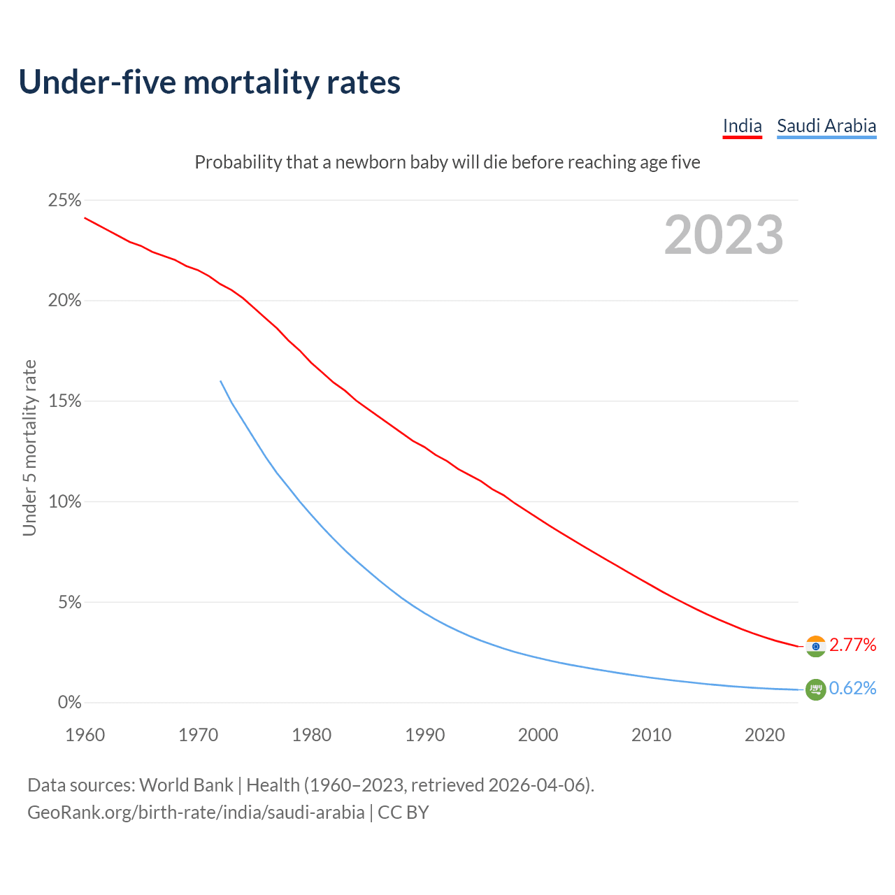 The chance that a newborn baby will die before reaching age five is 2.77% in India and 0.62% in Saudi Arabia. Above is a chart with historical data on under-five mortality rates.