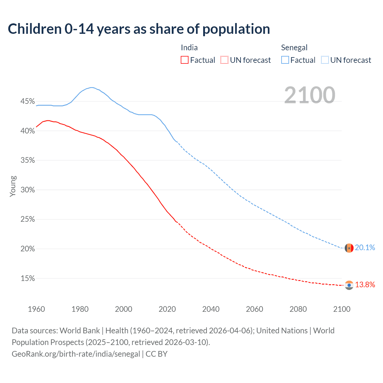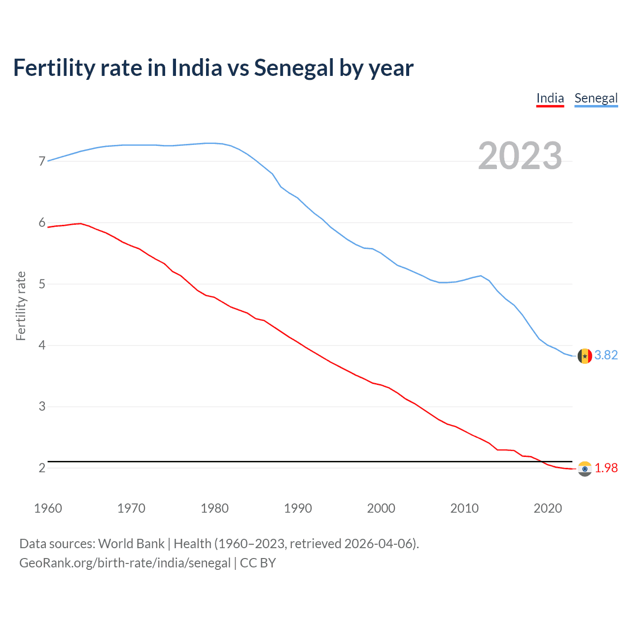 According to the latest available data on birth rates, the fertility rate in India was 1.98 children per woman in 2023, compared to 3.82 in Senegal in 2023. The replacement level is considered to be 2.1 children per woman.