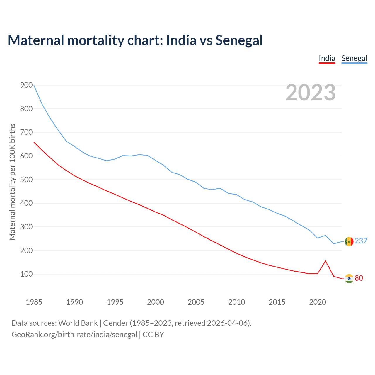 The maternal mortality rate, which is the probability of dying during childbirth or within 42 days of pregnancy termination, is 80 deaths per 100,000 live births in India, compared to 237 deaths in Senegal.