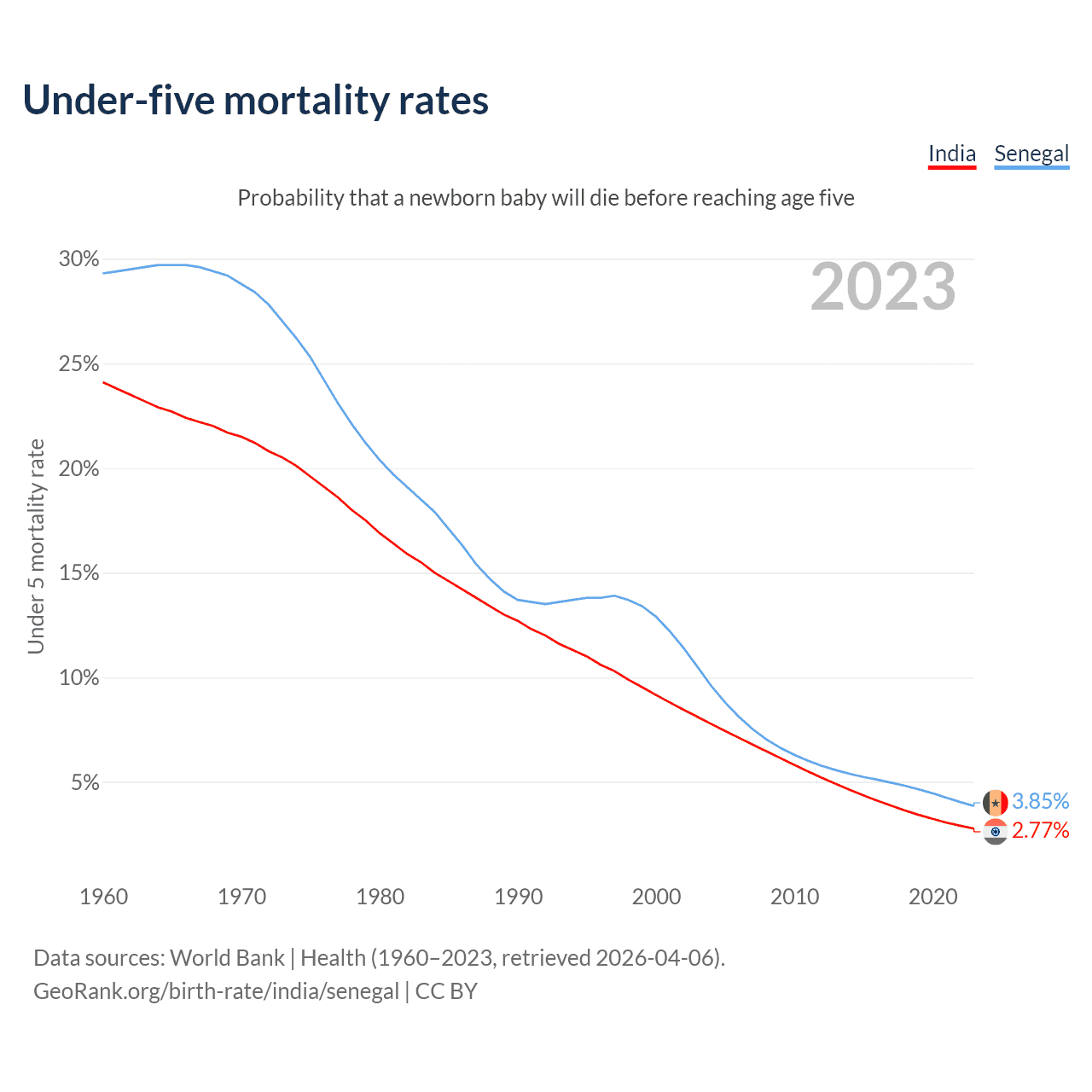 The chance that a newborn baby will die before reaching age five is 2.77% in India and 3.85% in Senegal. Above is a chart with historical data on under-five mortality rates.