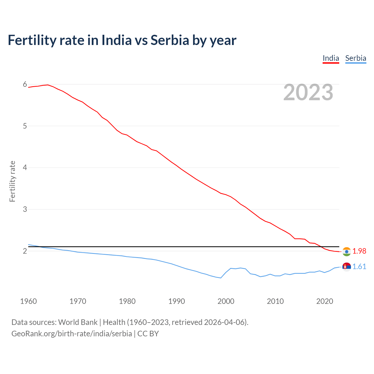 According to the latest available data on birth rates, the fertility rate in India was 1.98 children per woman in 2023, compared to 1.61 in Serbia in 2023. The replacement level is considered to be 2.1 children per woman.