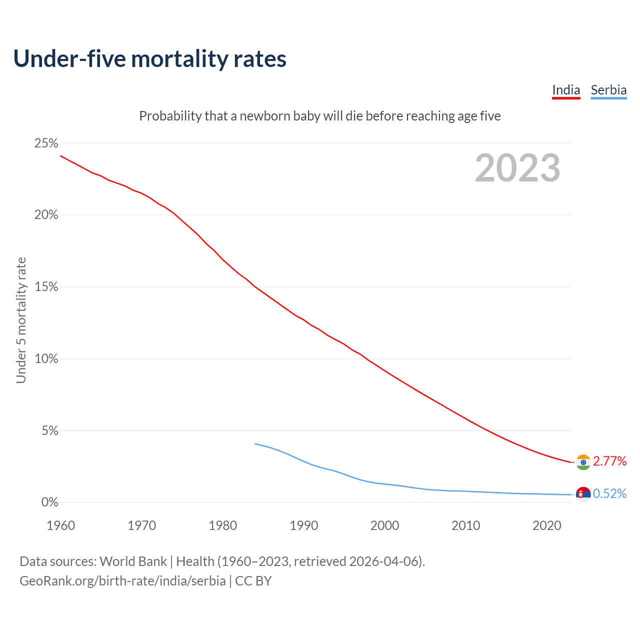 The chance that a newborn baby will die before reaching age five is 2.77% in India and 0.52% in Serbia. Above is a chart with historical data on under-five mortality rates.