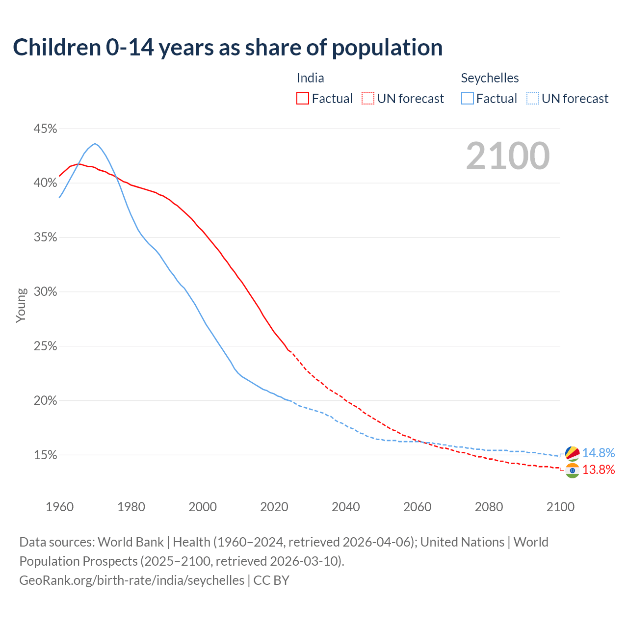 According to the latest available data on birth rates, the fertility rate in India was 1.98 children per woman in 2023, compared to 2.02 in the Seychelles in 2023. The replacement level is considered to be 2.1 children per woman.