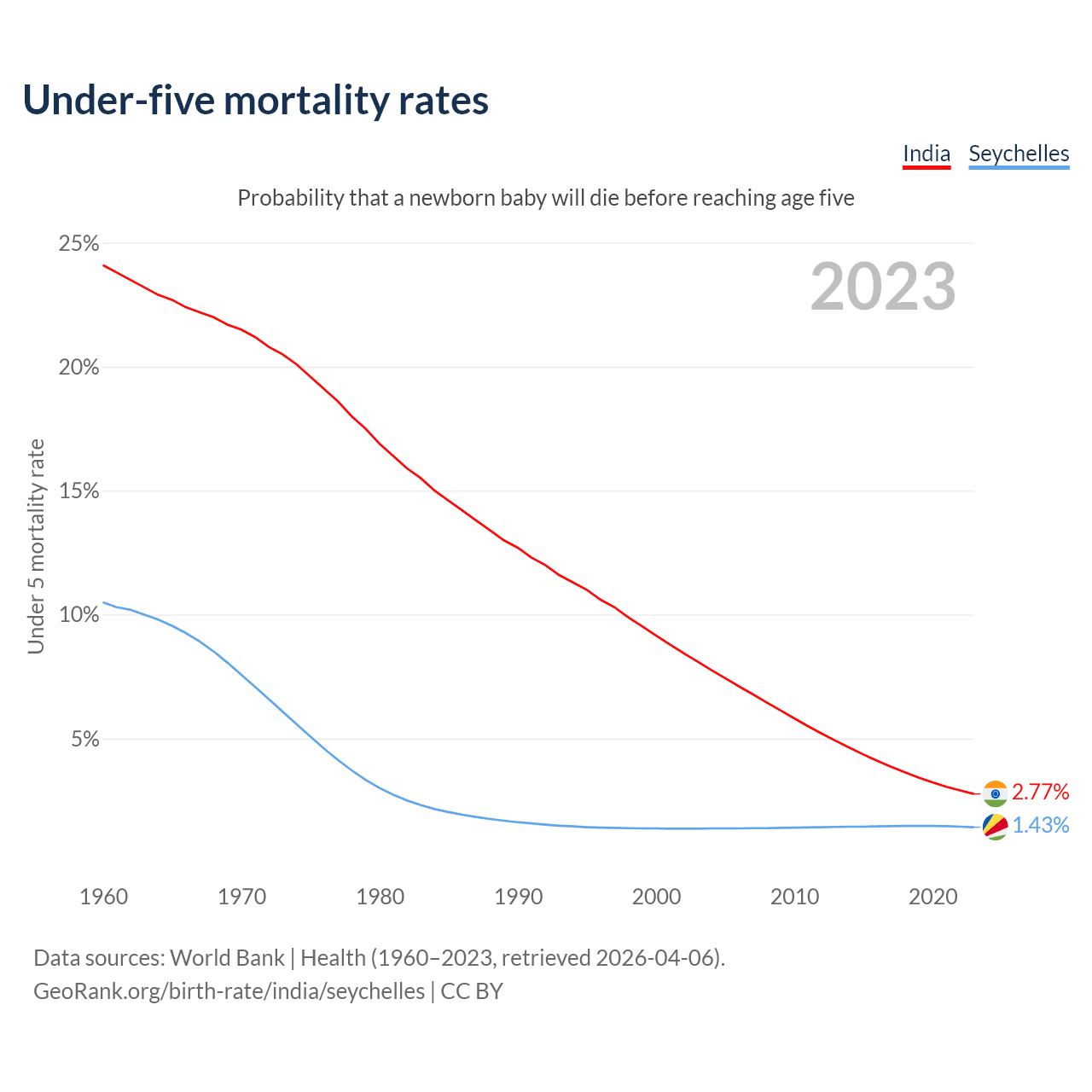 The chance that a newborn baby will die before reaching age five is 2.77% in India and 1.43% in the Seychelles. Above is a chart with historical data on under-five mortality rates.