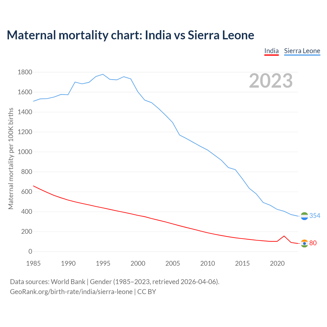 The maternal mortality rate, which is the probability of dying during childbirth or within 42 days of pregnancy termination, is 80 deaths per 100,000 live births in India, compared to 354 deaths in Sierra Leone.