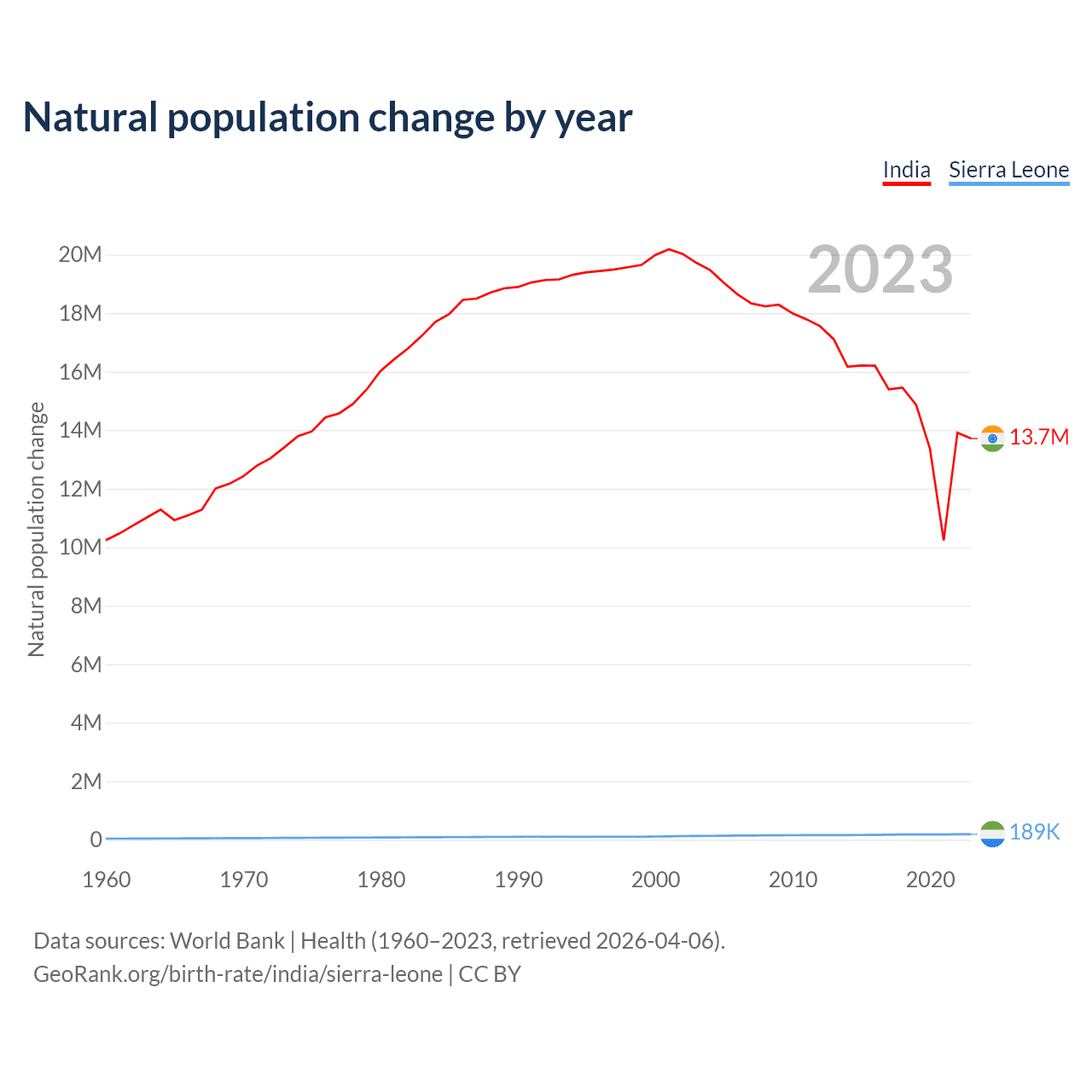 India has an annual birth rate of 16.1 births per 1,000 people, compared to 30.6 for Sierra Leone. The average number of children a woman is expected to have during her lifetime — the fertility rate, is 1.98 in India and 3.79 in Sierra Leone — 91.9% difference.