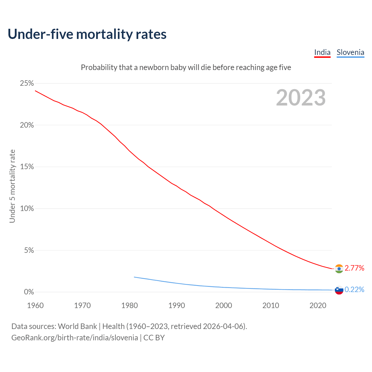The chance that a newborn baby will die before reaching age five is 2.77% in India and 0.22% in Slovenia. Above is a chart with historical data on under-five mortality rates.
