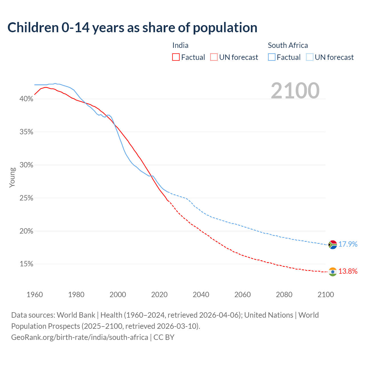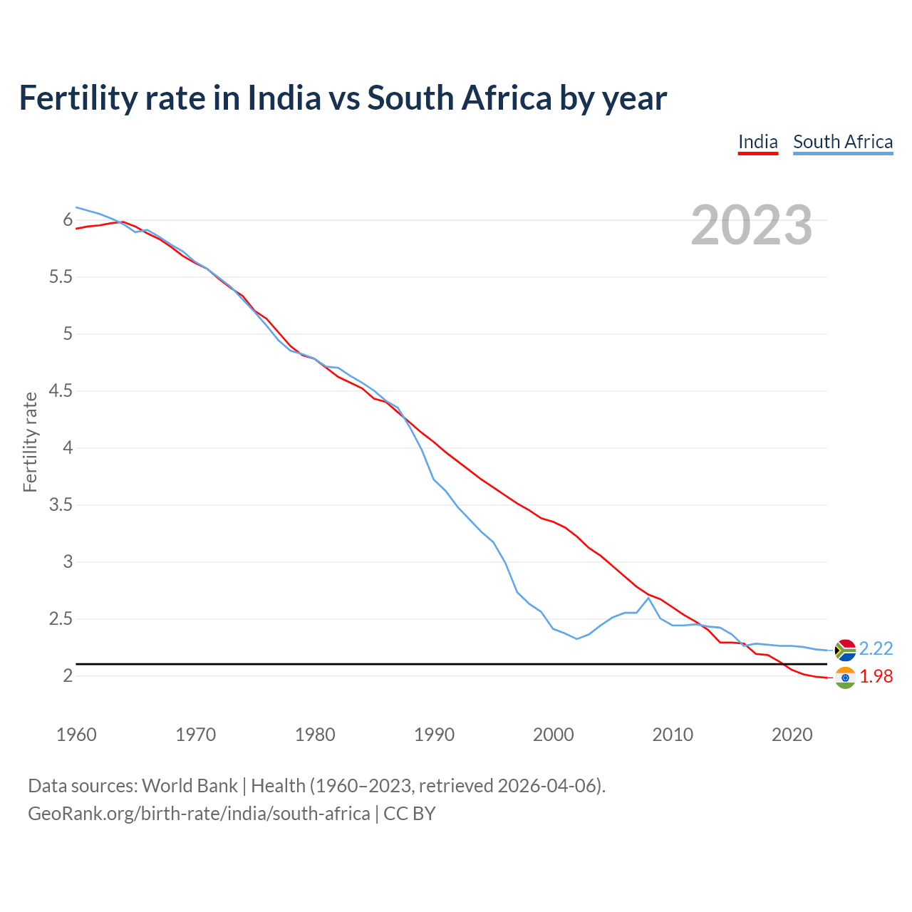 According to the latest available data on birth rates, the fertility rate in India was 1.98 children per woman in 2023, compared to 2.22 in South Africa in 2023. The replacement level is considered to be 2.1 children per woman.