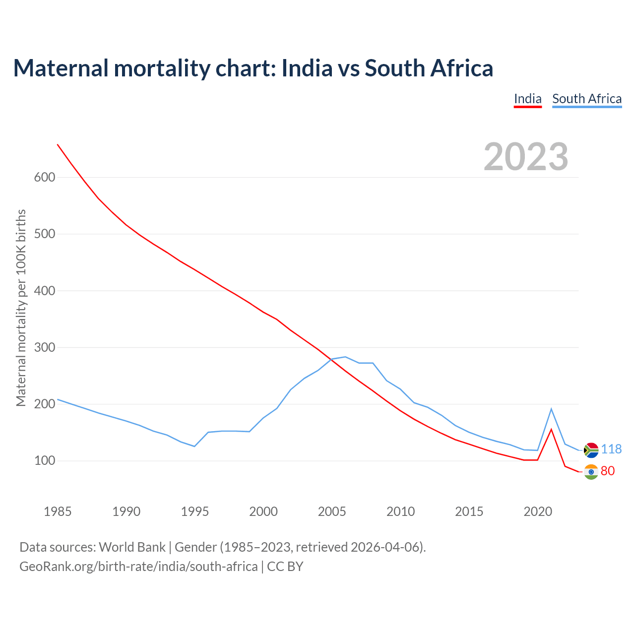 The maternal mortality rate, which is the probability of dying during childbirth or within 42 days of pregnancy termination, is 80 deaths per 100,000 live births in India, compared to 118 deaths in South Africa.