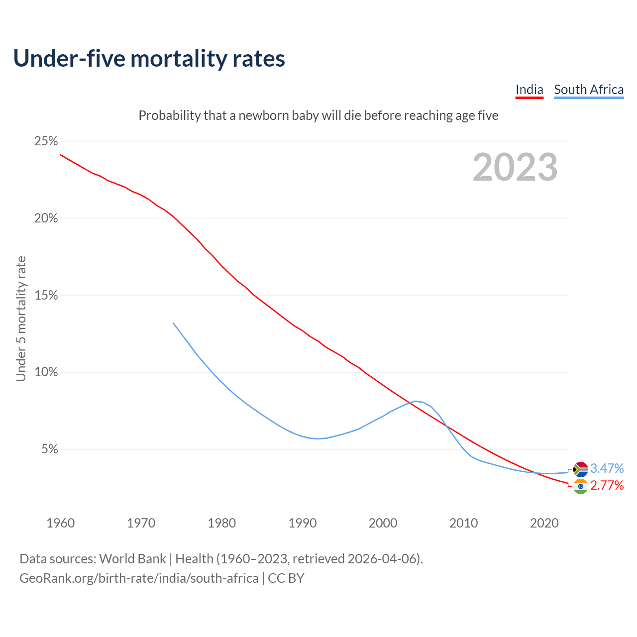 The chance that a newborn baby will die before reaching age five is 2.77% in India and 3.47% in South Africa. Above is a chart with historical data on under-five mortality rates.