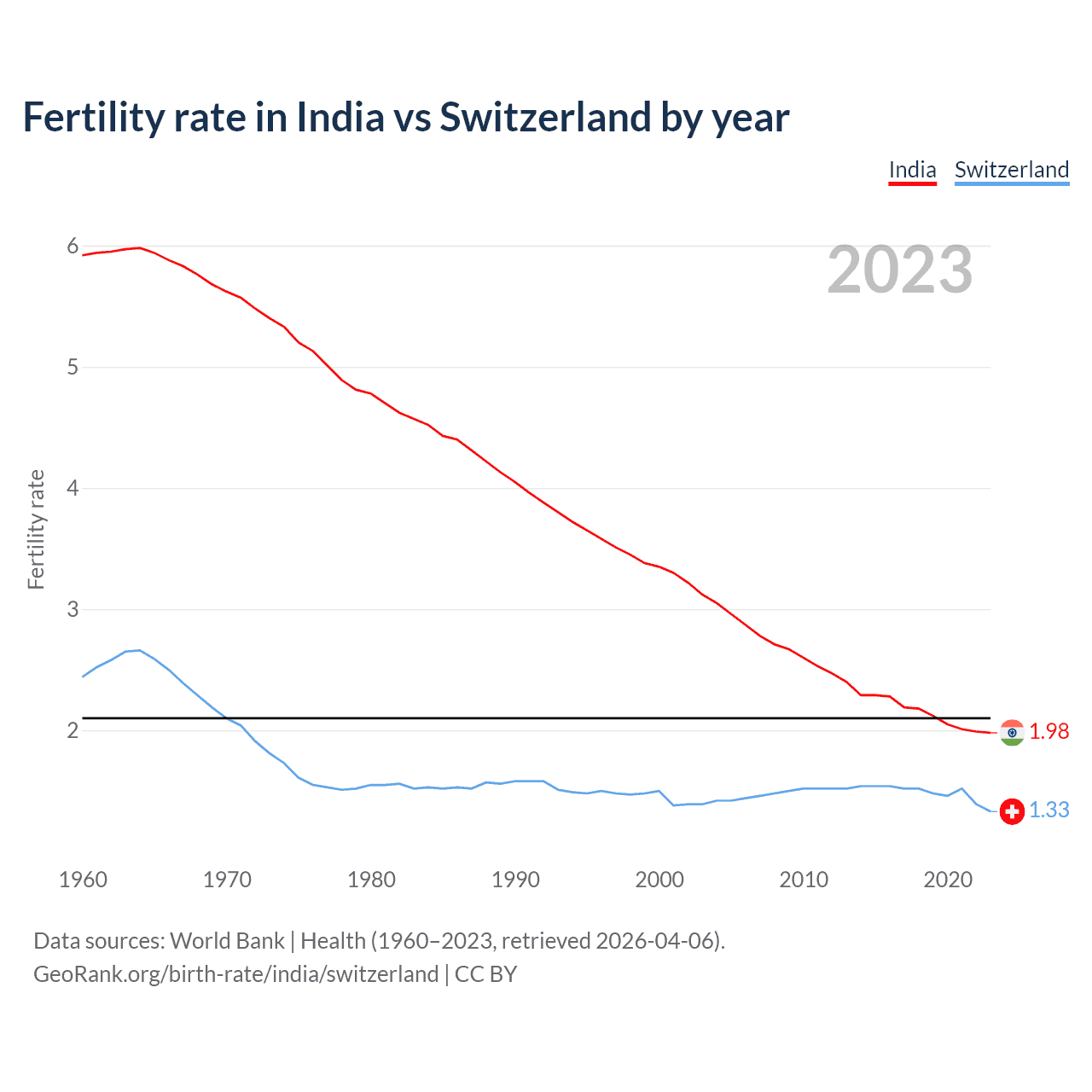 According to the latest available data on birth rates, the fertility rate in India was 1.98 children per woman in 2023, compared to 1.33 in Switzerland in 2023. The replacement level is considered to be 2.1 children per woman.