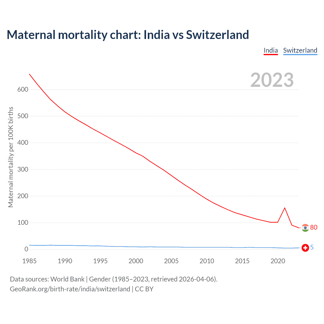 The maternal mortality rate, which is the probability of dying during childbirth or within 42 days of pregnancy termination, is 80 deaths per 100,000 live births in India, compared to 5 deaths in Switzerland.