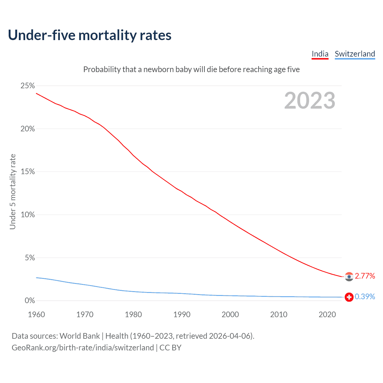 The chance that a newborn baby will die before reaching age five is 2.77% in India and 0.39% in Switzerland. Above is a chart with historical data on under-five mortality rates.
