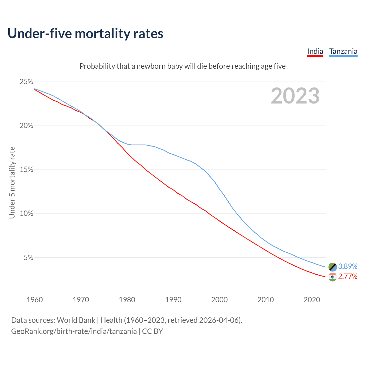 The chance that a newborn baby will die before reaching age five is 2.77% in India and 3.89% in Tanzania. Above is a chart with historical data on under-five mortality rates.