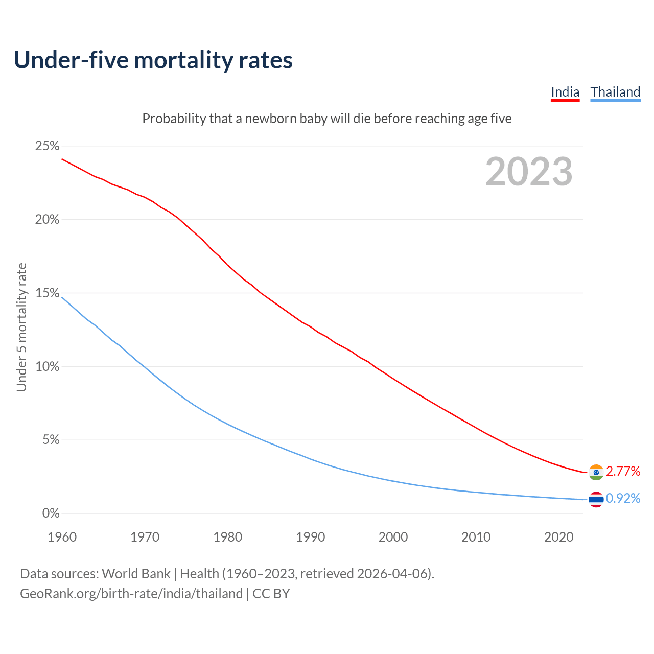 The chance that a newborn baby will die before reaching age five is 2.77% in India and 0.92% in Thailand. Above is a chart with historical data on under-five mortality rates.