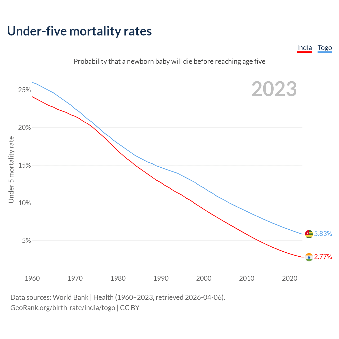 The chance that a newborn baby will die before reaching age five is 2.77% in India and 5.83% in Togo. Above is a chart with historical data on under-five mortality rates.