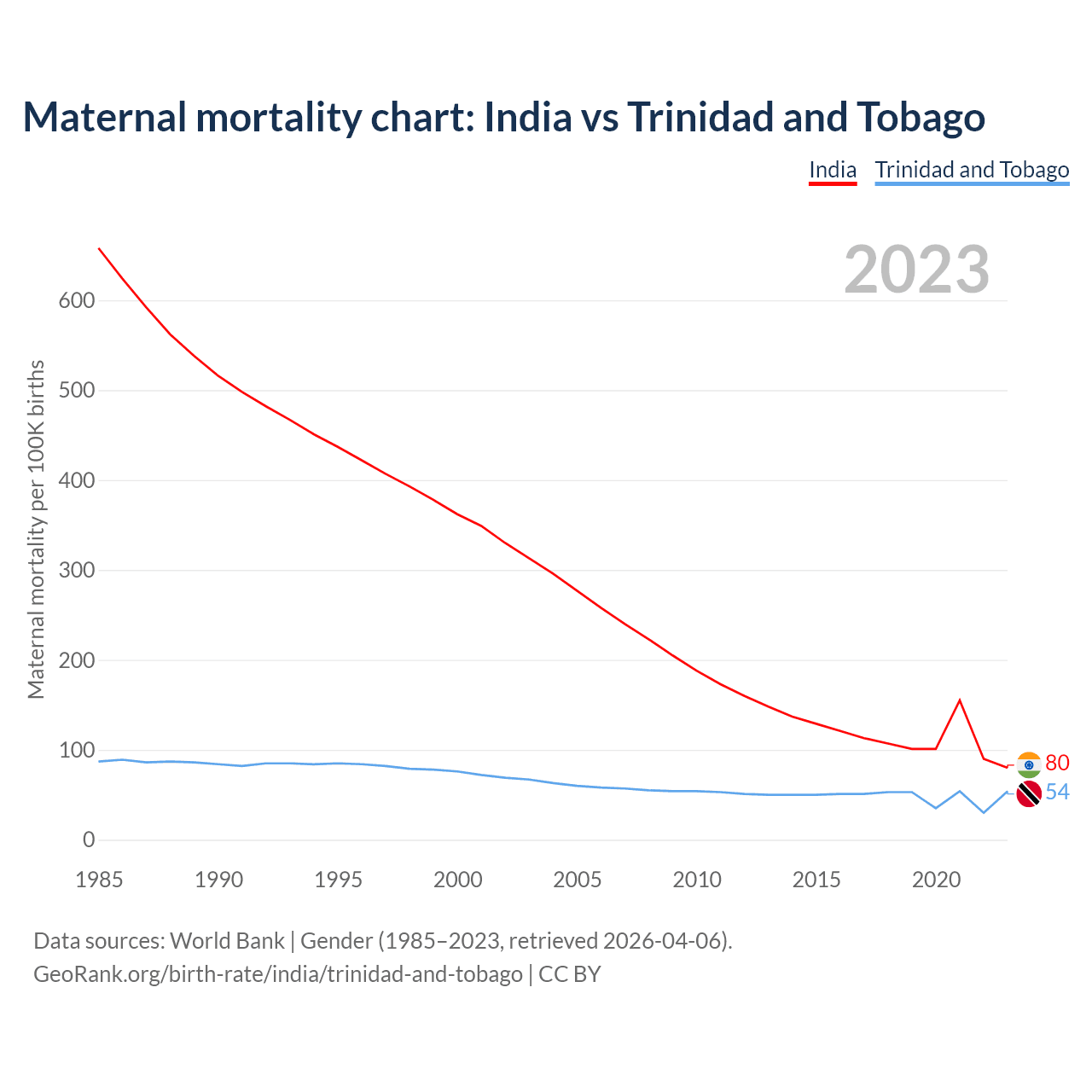 The maternal mortality rate, which is the probability of dying during childbirth or within 42 days of pregnancy termination, is 80 deaths per 100,000 live births in India, compared to 54 deaths in Trinidad and Tobago.