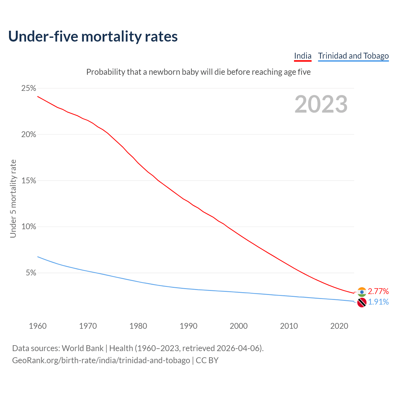 The chance that a newborn baby will die before reaching age five is 2.77% in India and 1.91% in Trinidad and Tobago. Above is a chart with historical data on under-five mortality rates.