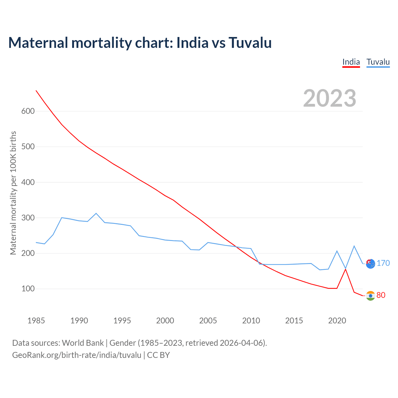 The maternal mortality rate, which is the probability of dying during childbirth or within 42 days of pregnancy termination, is 80 deaths per 100,000 live births in India, compared to 170 deaths in Tuvalu.