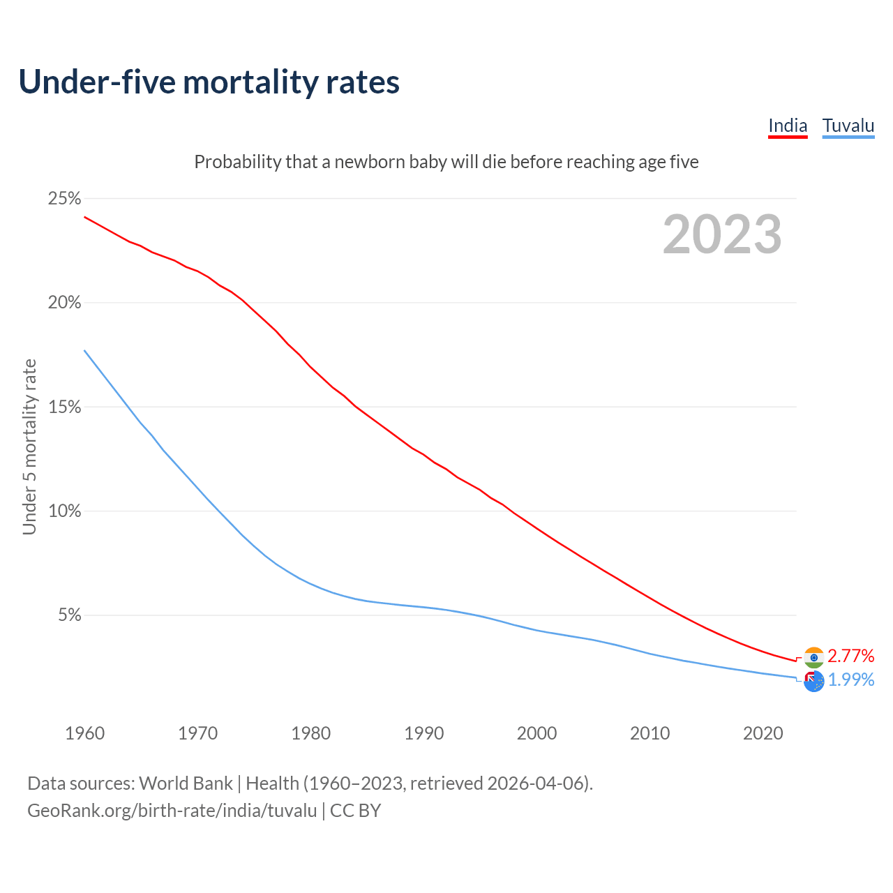 The chance that a newborn baby will die before reaching age five is 2.77% in India and 1.99% in Tuvalu. Above is a chart with historical data on under-five mortality rates.