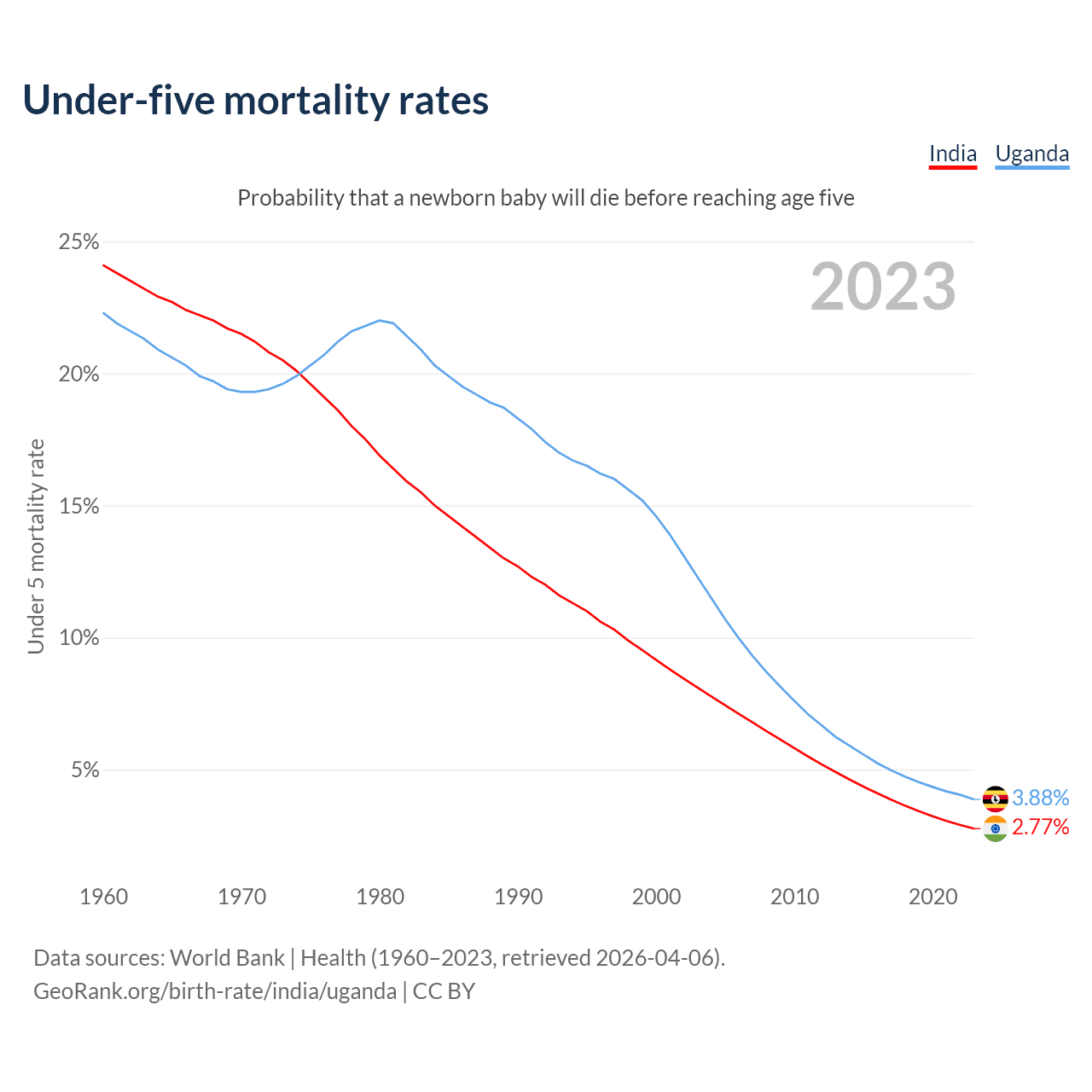 The chance that a newborn baby will die before reaching age five is 2.77% in India and 3.88% in Uganda. Above is a chart with historical data on under-five mortality rates.