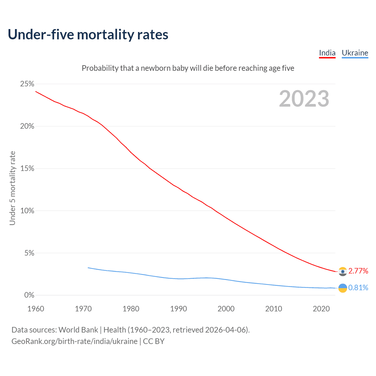 The chance that a newborn baby will die before reaching age five is 2.77% in India and 0.81% in Ukraine. Above is a chart with historical data on under-five mortality rates.
