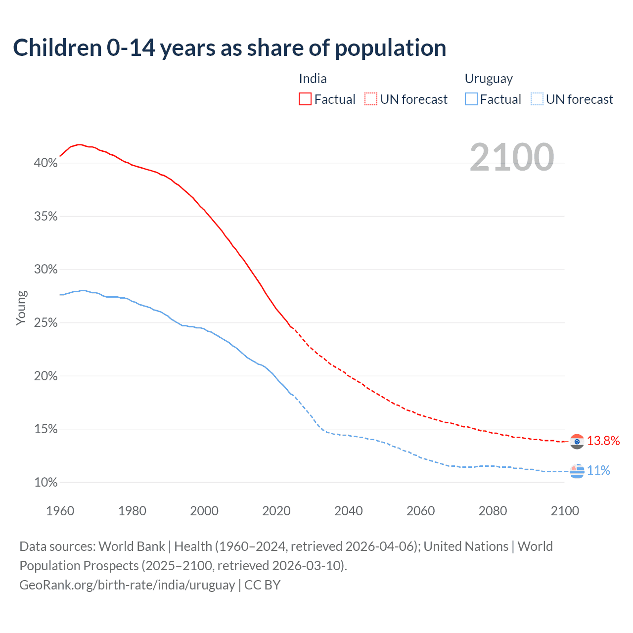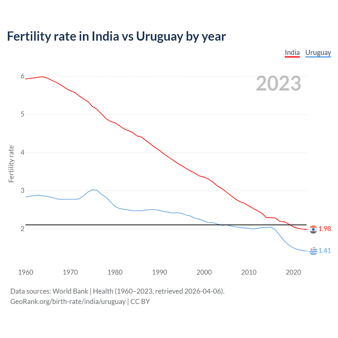 According to the latest available data on birth rates, the fertility rate in India was 1.98 children per woman in 2023, compared to 1.41 in Uruguay in 2023. The replacement level is considered to be 2.1 children per woman.