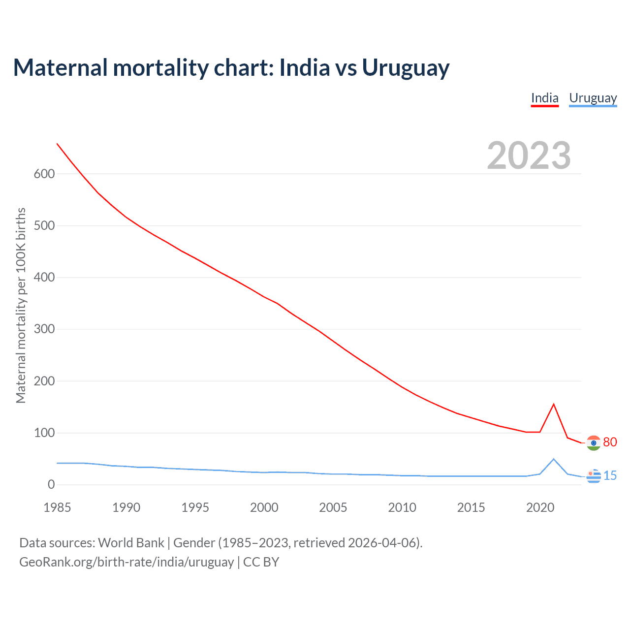 The maternal mortality rate, which is the probability of dying during childbirth or within 42 days of pregnancy termination, is 80 deaths per 100,000 live births in India, compared to 15 deaths in Uruguay.