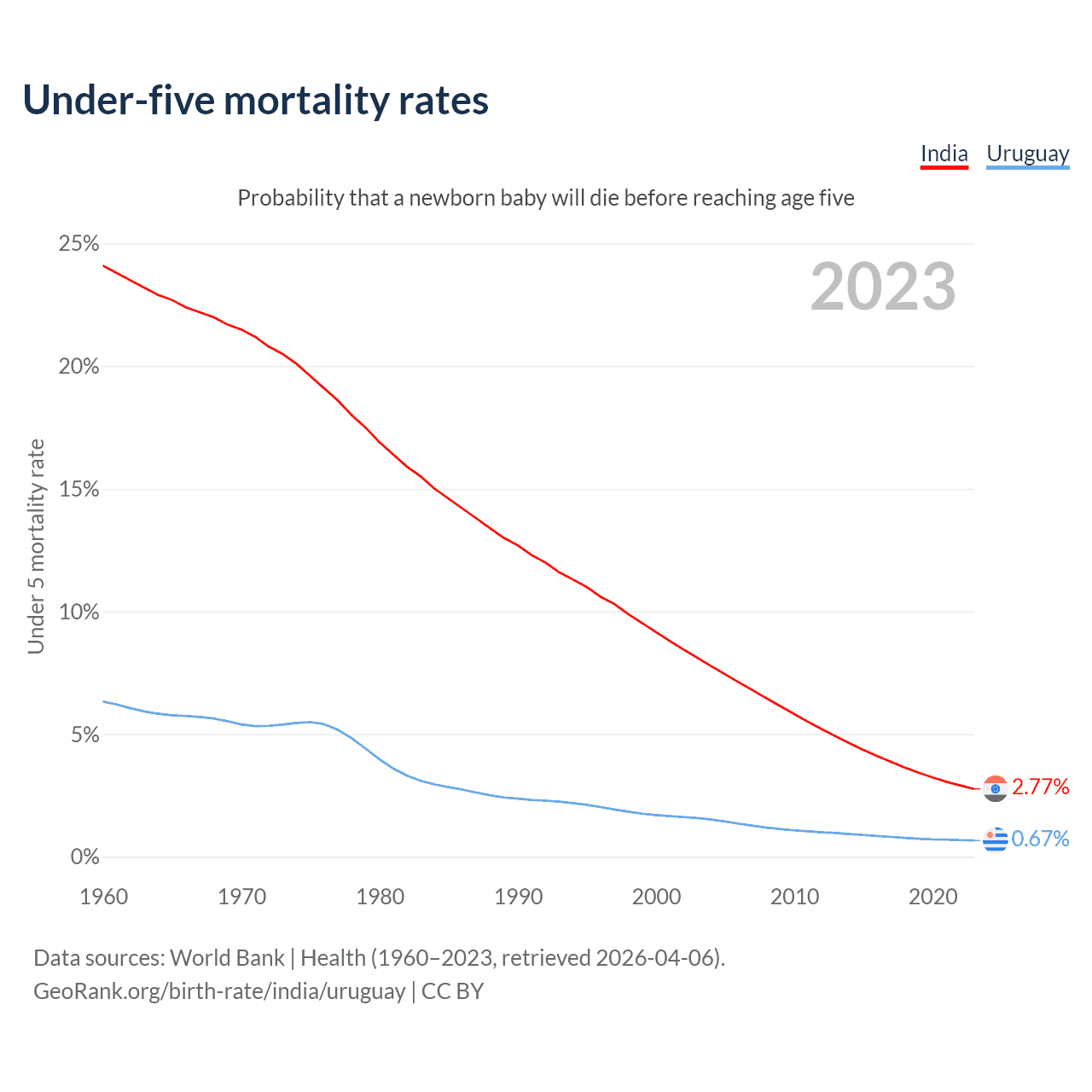 The chance that a newborn baby will die before reaching age five is 2.77% in India and 0.67% in Uruguay. Above is a chart with historical data on under-five mortality rates.