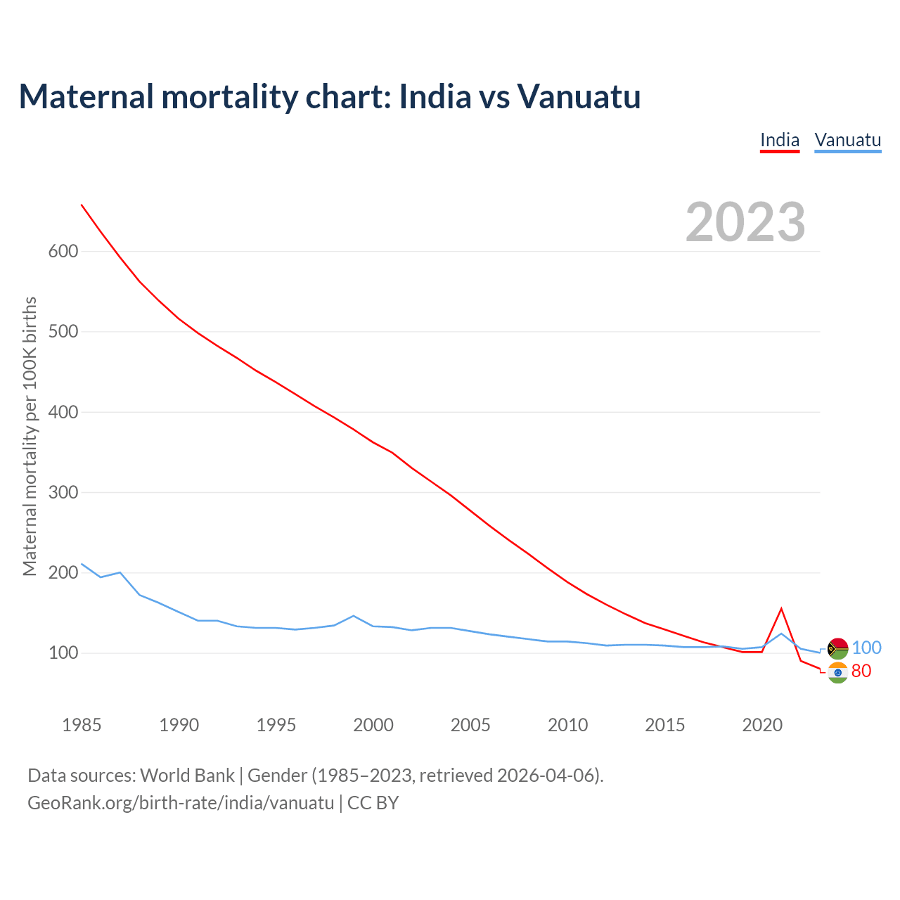 The maternal mortality rate, which is the probability of dying during childbirth or within 42 days of pregnancy termination, is 80 deaths per 100,000 live births in India, compared to 100 deaths in Vanuatu.