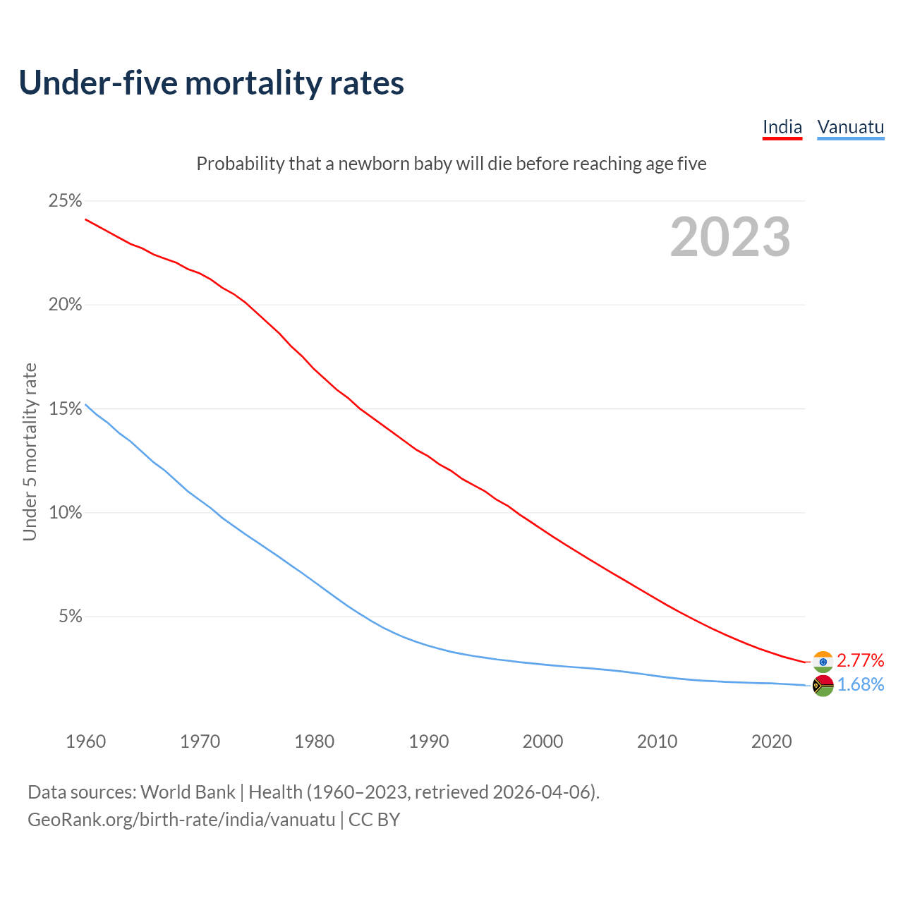 The chance that a newborn baby will die before reaching age five is 2.77% in India and 1.68% in Vanuatu. Above is a chart with historical data on under-five mortality rates.