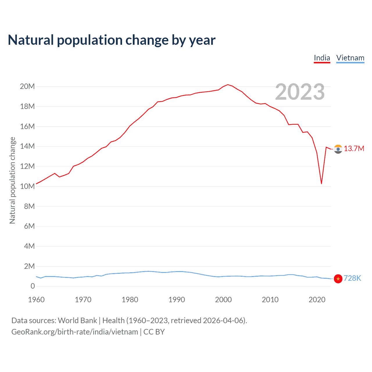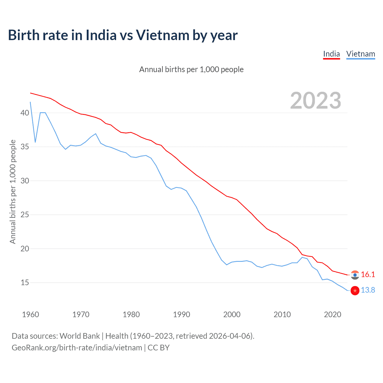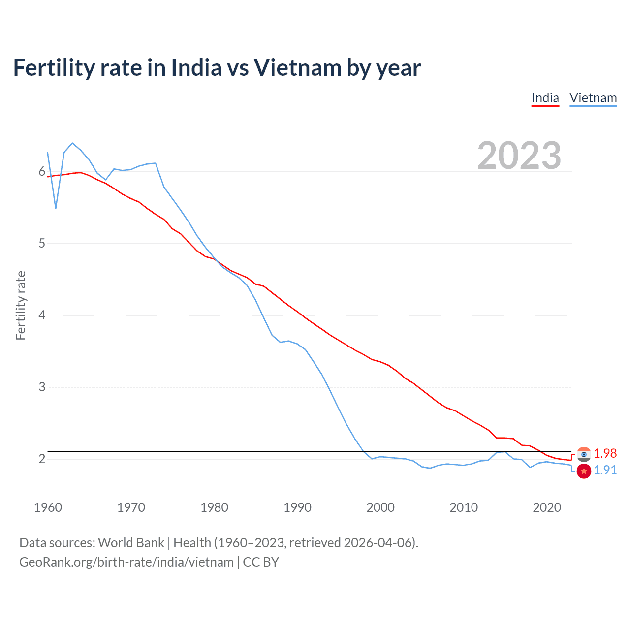 According to the latest available data on birth rates, the fertility rate in India was 1.98 children per woman in 2023, compared to 1.91 in Vietnam in 2023. The replacement level is considered to be 2.1 children per woman.