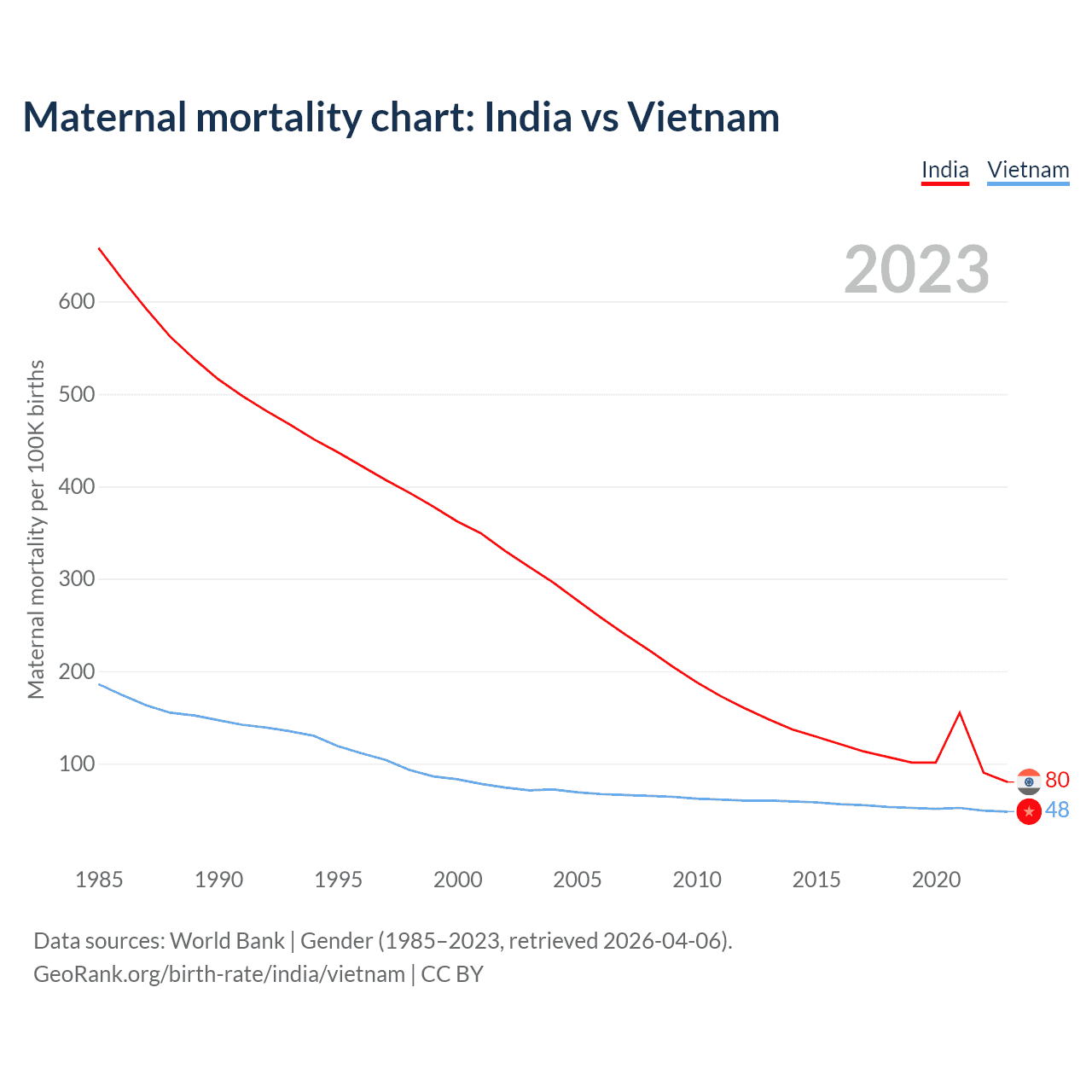 The maternal mortality rate, which is the probability of dying during childbirth or within 42 days of pregnancy termination, is 80 deaths per 100,000 live births in India, compared to 48 deaths in Vietnam.