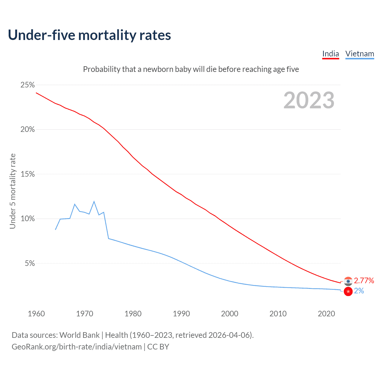 The chance that a newborn baby will die before reaching age five is 2.77% in India and 2% in Vietnam. Above is a chart with historical data on under-five mortality rates.