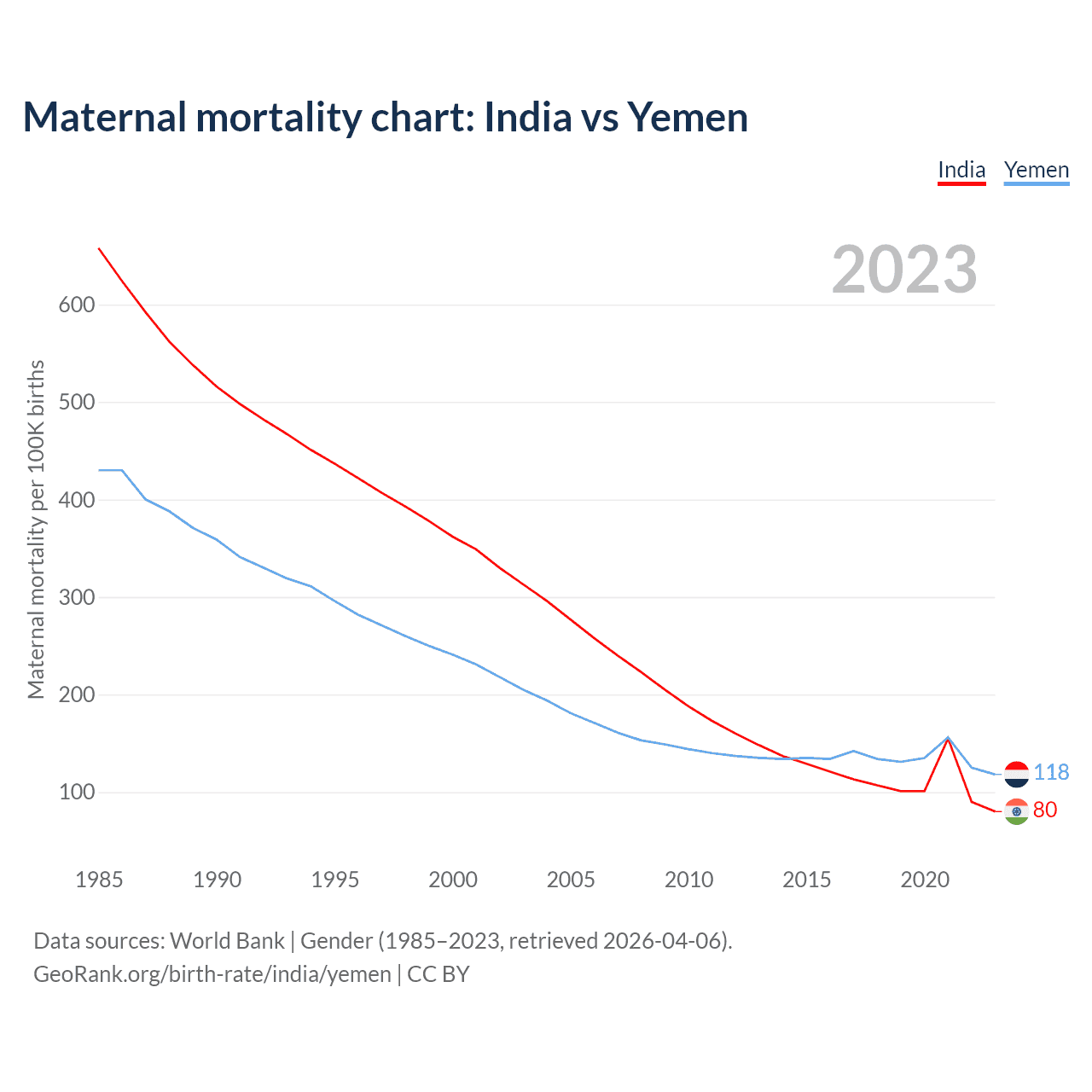 The maternal mortality rate, which is the probability of dying during childbirth or within 42 days of pregnancy termination, is 80 deaths per 100,000 live births in India, compared to 118 deaths in Yemen.