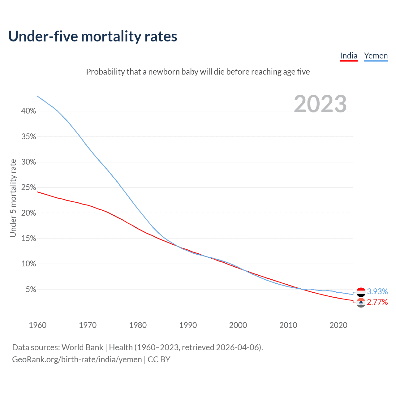 The chance that a newborn baby will die before reaching age five is 2.77% in India and 3.93% in Yemen. Above is a chart with historical data on under-five mortality rates.