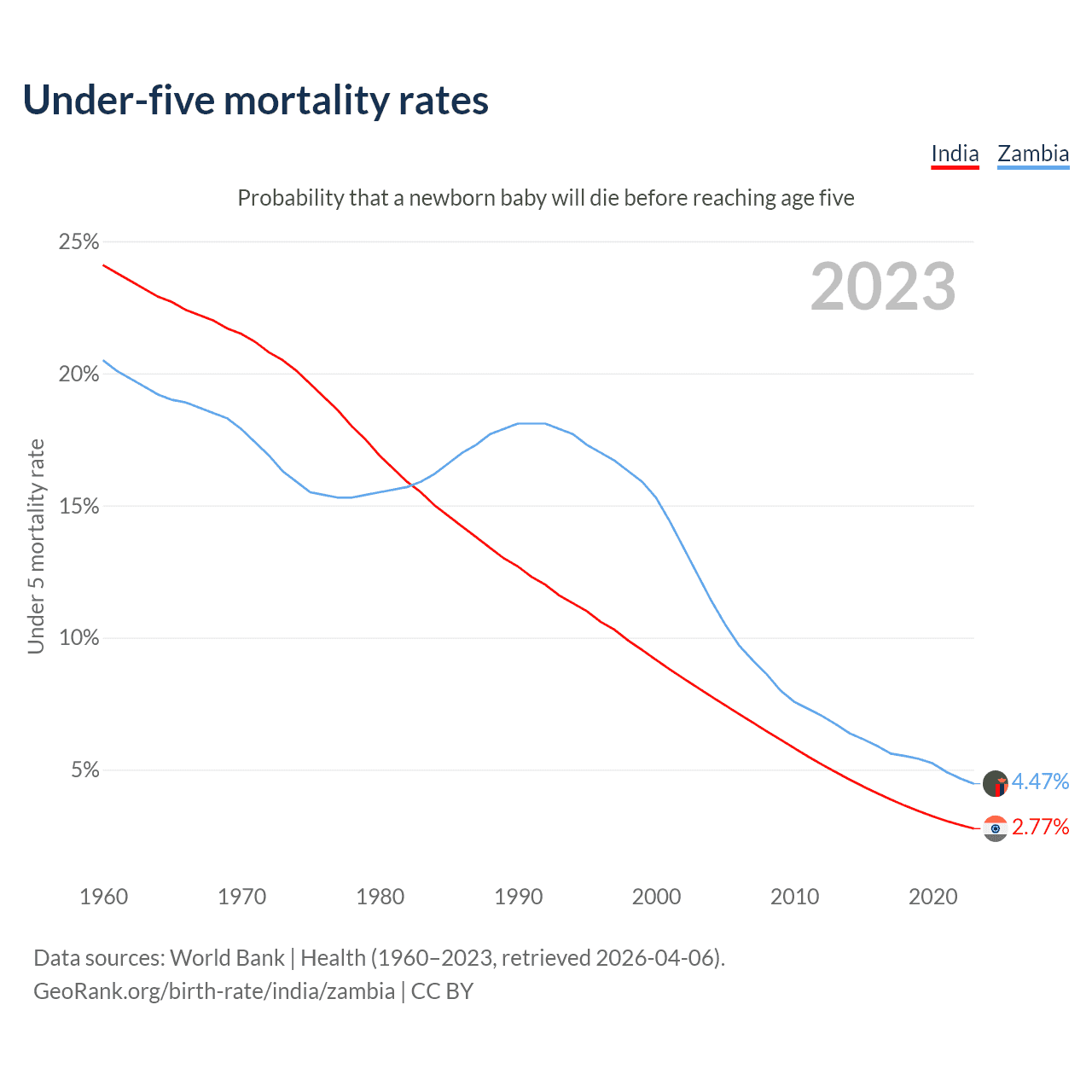 The chance that a newborn baby will die before reaching age five is 2.77% in India and 4.47% in Zambia. Above is a chart with historical data on under-five mortality rates.