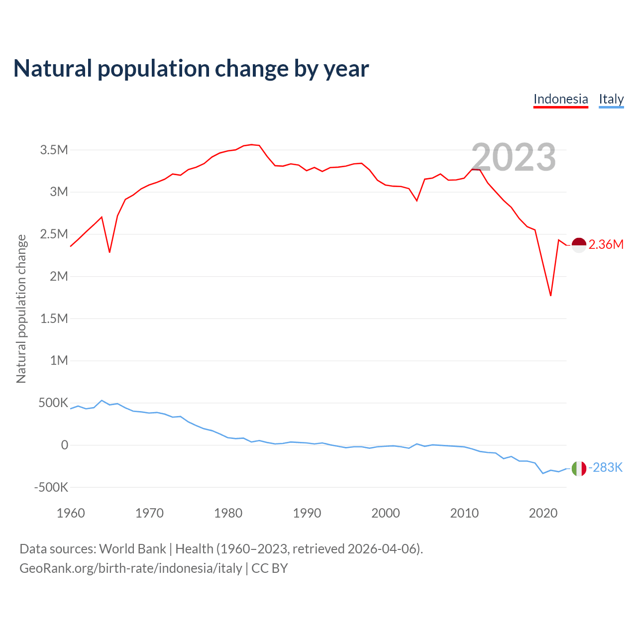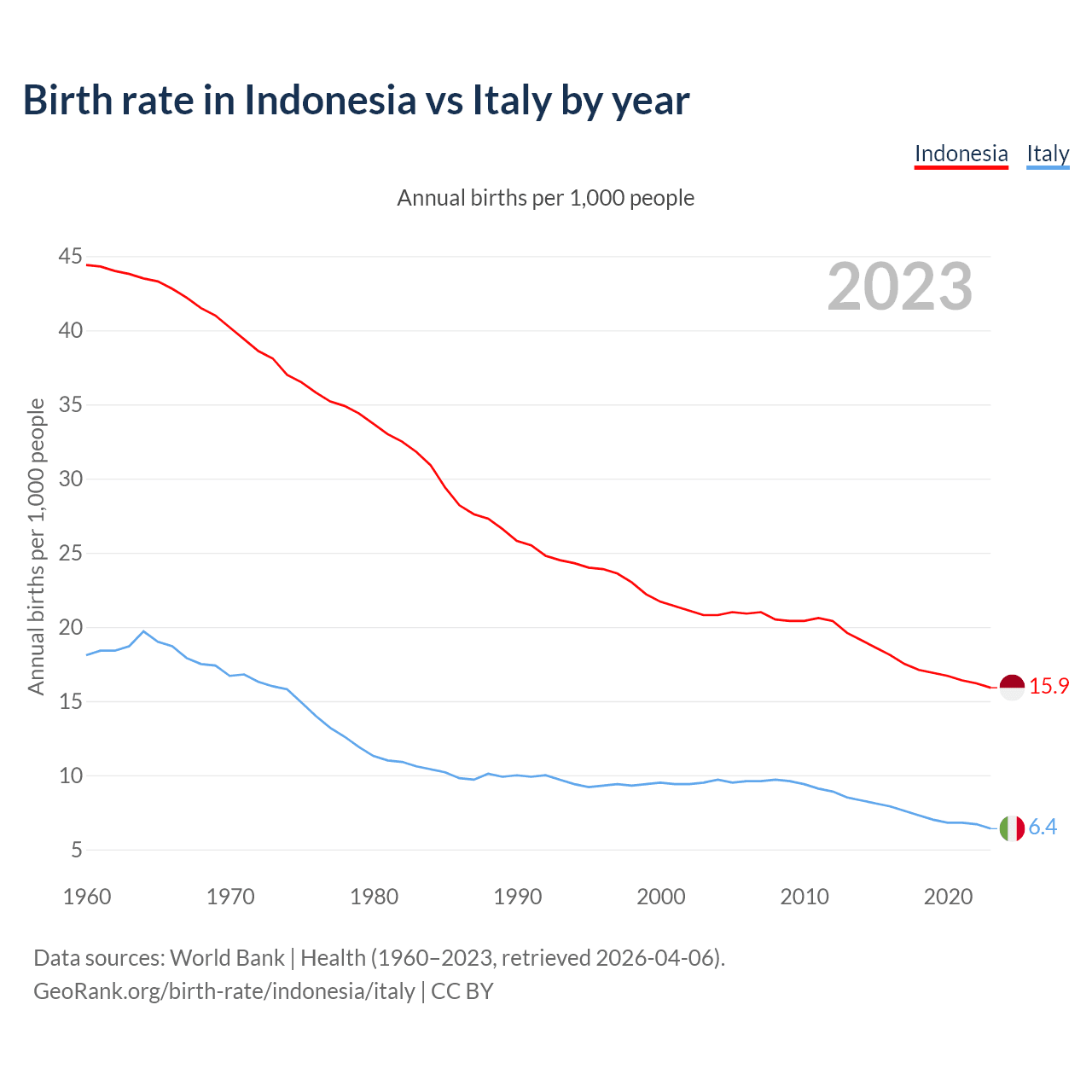Indonesia has an annual birth rate of 15.9 births per 1,000 people, compared to 6.4 for Italy. The average number of children a woman is expected to have during her lifetime — the fertility rate, is 2.13 in Indonesia and 1.2 in Italy — 43.6% difference.