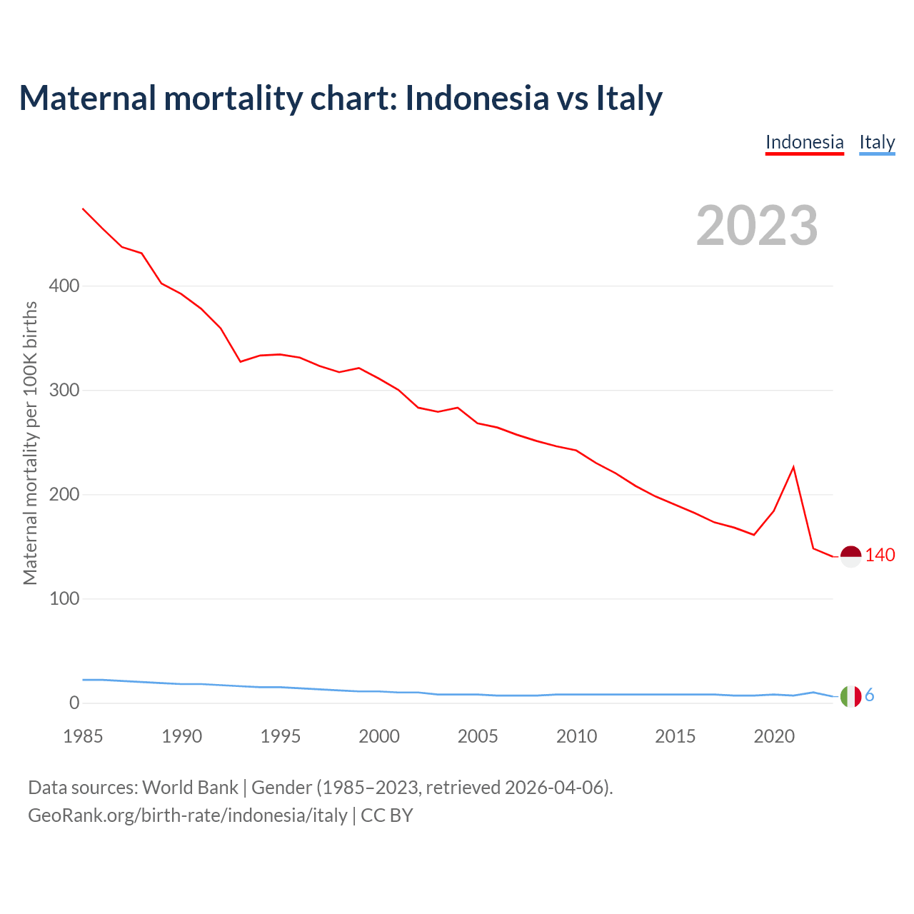 The maternal mortality rate, which is the probability of dying during childbirth or within 42 days of pregnancy termination, is 140 deaths per 100,000 live births in Indonesia, compared to 6 deaths in Italy.