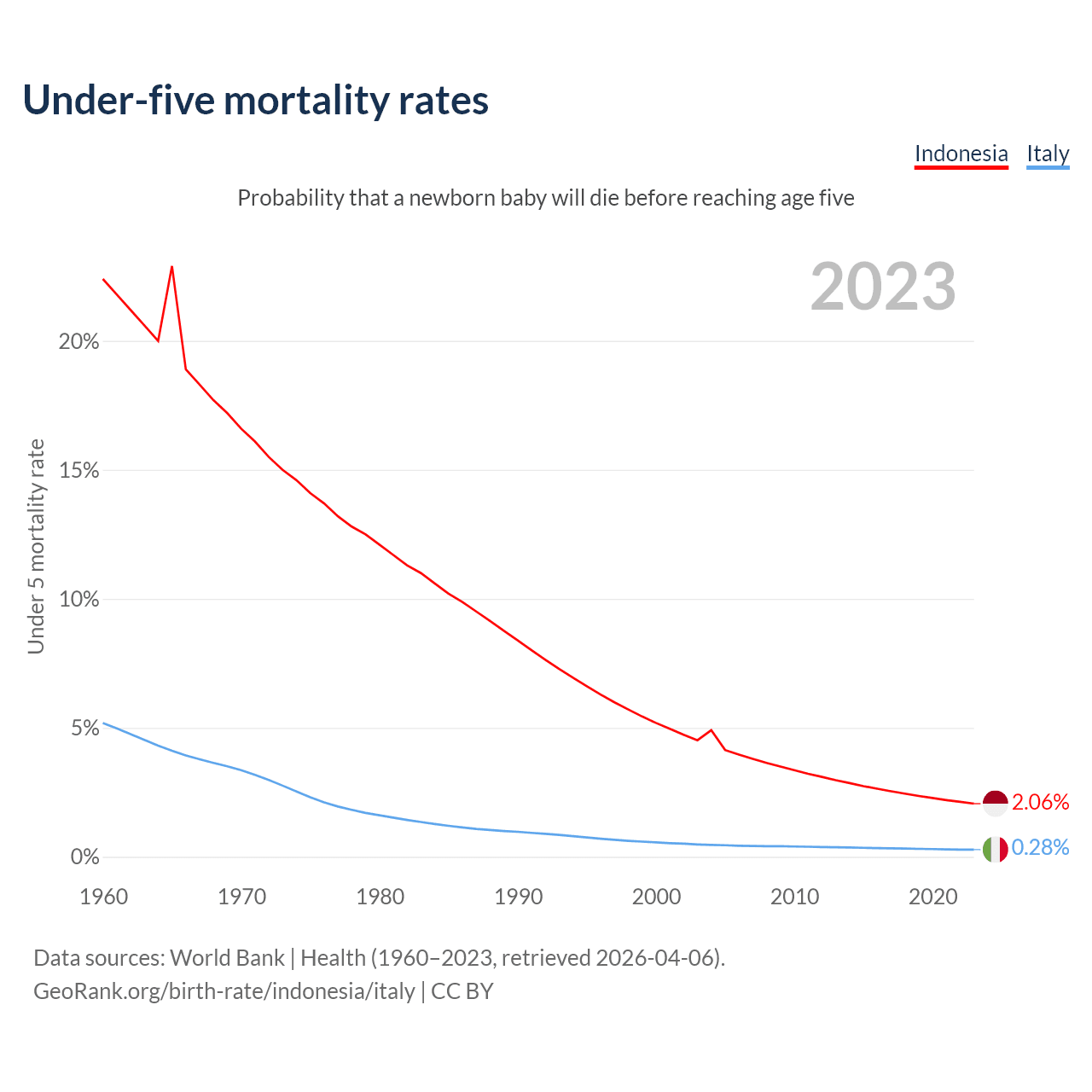 The chance that a newborn baby will die before reaching age five is 2.06% in Indonesia and 0.28% in Italy. Above is a chart with historical data on under-five mortality rates.