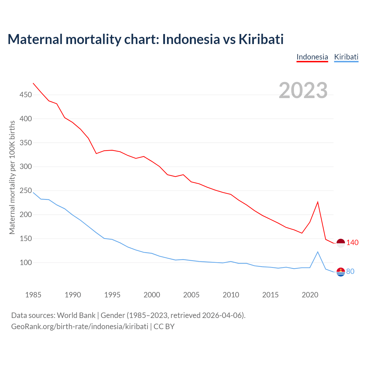The maternal mortality rate, which is the probability of dying during childbirth or within 42 days of pregnancy termination, is 140 deaths per 100,000 live births in Indonesia, compared to 80 deaths in Kiribati.