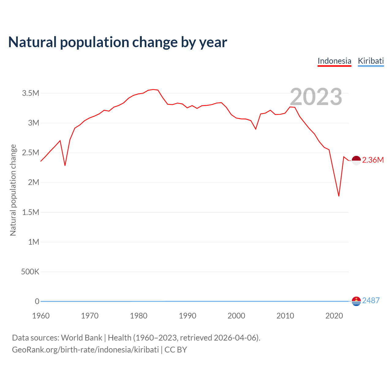 Indonesia has an annual birth rate of 15.9 births per 1,000 people, compared to 25.8 for Kiribati. The average number of children a woman is expected to have during her lifetime — the fertility rate, is 2.13 in Indonesia and 3.15 in Kiribati — 48% difference.