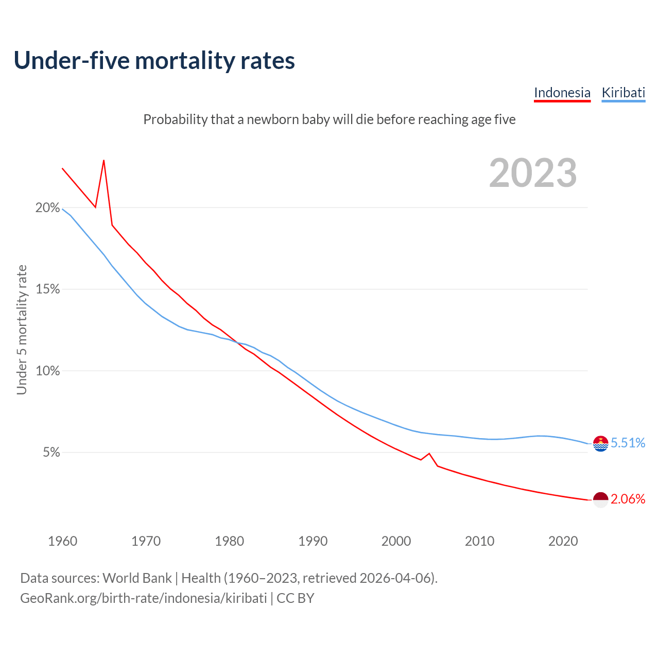 The chance that a newborn baby will die before reaching age five is 2.06% in Indonesia and 5.51% in Kiribati. Above is a chart with historical data on under-five mortality rates.