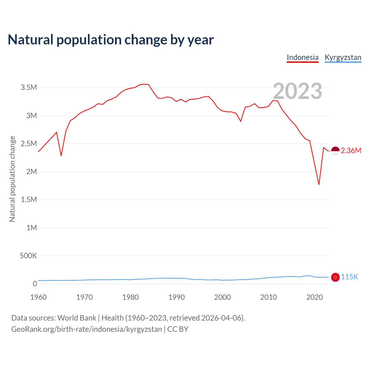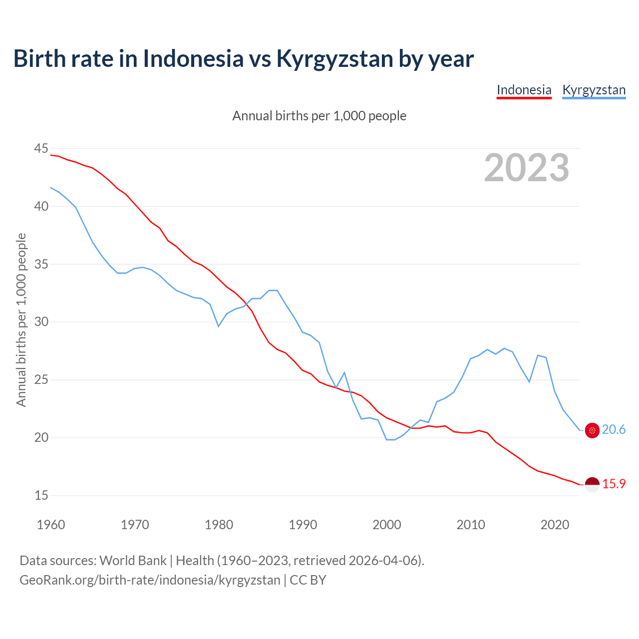 Indonesia has an annual birth rate of 15.9 births per 1,000 people, compared to 20.6 for Kyrgyzstan. The average number of children a woman is expected to have during her lifetime — the fertility rate, is 2.13 in Indonesia and 2.7 in Kyrgyzstan — 26.9% difference.