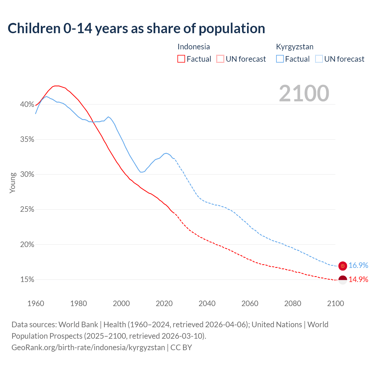 According to the latest available data on birth rates, the fertility rate in Indonesia was 2.13 children per woman in 2023, compared to 2.7 in Kyrgyzstan in 2023. The replacement level is considered to be 2.1 children per woman.